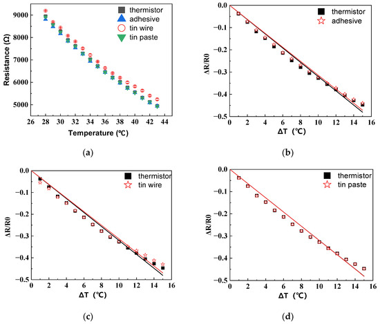 Figure 6. Temperature–resistance responses of HETS yarn with three different interconnection methods. (a) Resistance–temperature change; (b) relative change for conductive adhesive bonding; (c) relative change for soldering with tin wire; (d) relative change for soldering with tin paste.