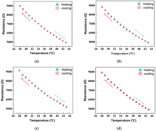 Figure 8. Temperature–resistance relationship of thermistor and sensing yarns with three interconnection methods under heating–cooling cycles. (a) thermistor; (b) conductive adhesive bonding; (c) melt soldering with tin wire; (d) heat pressing soldering with tin paste. The arrows indicate the cooling or heating direction.