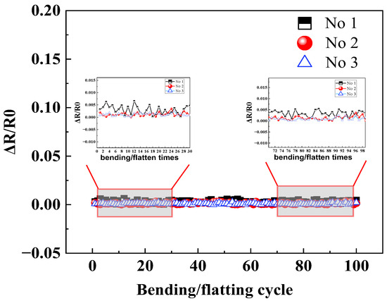 By conducting a total comparison of the sensitivity, max hysteresis error, and response time, tin paste soldering among three interconnection methods is the optimal technology, and then the bending fatigue test was applied for HETS yarn using the tin paste soldering interconnection method. The hybrid yarn produced by tin paste soldering exhibited superior sensing properties, as evidenced by its resistance change after the 100 bending/flattening cycles shown in Figure 10. The relative resistance change remained minimal even after undergoing 100 bending/flatting cycles, which is consistent with the findings reported [10]. This observation suggests that HETS yarn with tin paste soldering demonstrates enhanced mechanical endurance performance during wear and washing; herewith, the following work discusses the encapsulation effect of HETS yarn with tin paste soldering.