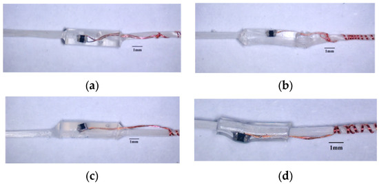 Figure 11. The morphology of interconnection area encapsulated with different materials. (a) PUA; (b) PDMS; (c) Ecoflex; (d) heating shrinkable tube.