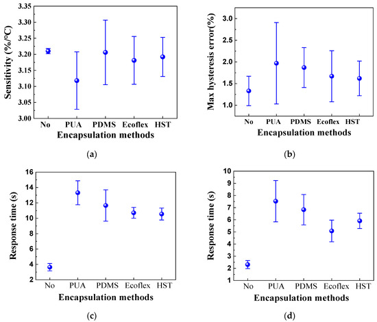 Figure 12. Sensing performance of HETS yarn with different encapsulation methods. (a) Sensitivity; (b) maximum hysteresis error; (c) natural cooling; and (d) heating.