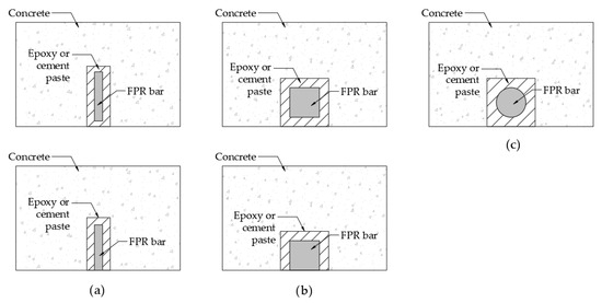 NSM systems with different bar shapes for FRP: (a) NSM with plate-shaped bar, (b) NSM with rectangular bar, and (c) NSM with round bar.