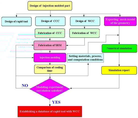 The main objective of this study is to propose an injection mold with an innovative WCC. The WCC was optimized using Moldex3D simulation software. This study employed low-pressure wax injection molding to evaluate the rapid mold with two kinds of cooling channels. The cooling time of the molded part was investigated and compared with the simulation results using Moldex3D simulation software. The main conclusions from the experimental work in this study are as follows: