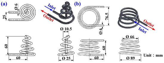 Figure 1 shows the flowchart of the experimental methodology. In this study, a molded part is a water cup featuring a shell thickness of 2 mm, a top diameter of 70 mm, a bottom diameter of 35 mm, and a height of 60 mm. The WCC was optimized using the Moldex3D numerical simulation software. The general procedures of running an injection molding simulation are shown in the figure, which involves pre-processing, analysis setup, and post-processing. Figure 2 shows the 3D CAD model and dimensions of the CCC for the core and cavity. According to the guidelines for the design of CCC, the channel diameter is 6 mm since the wall thickness of the injection molded part is 2 mm. The channel centerline to the mold wall distance is 12 mm since this distance is about two times the channel diameter. The pitch distance between cooling channels is 8 mm since the distance is about three times the channel diameter.