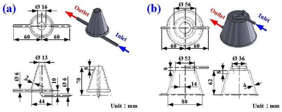 Three-dimensional CAD model and dimensions of the WCC for (a) core and (b) cavity.