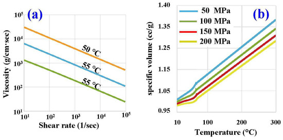 Injection molding simulation conditions of (a) viscosity and (b) PVT curves.