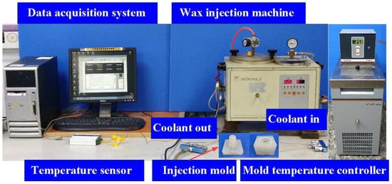 Figure 6 illustrates the setup employed for measuring the cooling time of the molded wax pattern. The injection molding experiments utilized a low-pressure wax injection molding machine (0660, W&W Inc., Lake Zurich, IL, USA). This configuration included K-type thermocouples (C071009-079, Cheng Tay Inc., New Taipei City, Taiwan) with a measurement sensitivity of ±1 °C, a mold temperature controller (JCM-33A, Shinko Inc., Tokyo, Japan), and a coolant reservoir with a thermo-electric cooler (TEC12706AJ, Caijia Inc., Taipei City, Taiwan). The temperature sensors were strategically placed in the silicone rubber mold cavity, and their other ends were connected to a data acquisition system (MRD-8002L, IDEA System Inc., New Taipei City, Taiwan). The ambient temperature was maintained at 27 °C. The horizontally oriented silicone rubber mold received molten wax at 82 °C into a mold cavity set at 27 °C. The ejection temperature for the molded wax patterns was set at 30 °C through a series of test runs. The inlet coolant temperature was kept at 27 °C. The temperature histories of the molded wax patterns were recorded using temperature sensors.