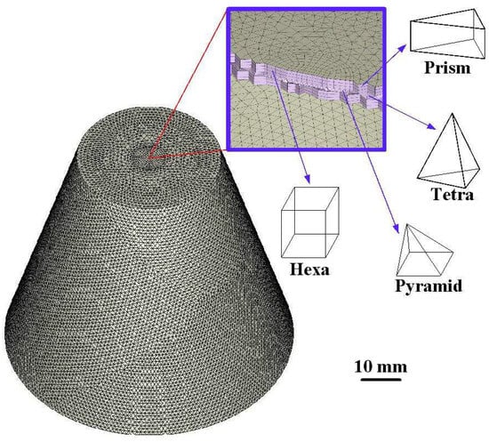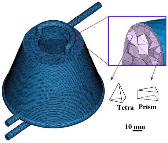 A boundary layer mesh (BLM) [24] has several advantages in mold flow simulations, mainly when dealing with flows near solid surfaces. In this study, BLM was used for mold flow simulations because the primary purpose of a BLM is to provide a higher mesh resolution near the walls of the solid surfaces. It is crucial for accurately capturing the boundary layer. In addition, a BLM boundary is compatible with intricate geometric models. The number of BLMs was five in this study. The three-dimensional solid mesh comprises a tetrahedron and prism. Figure 7 shows the mesh of the water cup. The number of boundary layers was 5, and the number of elements was 231,981. The numbers of pyramids, tetrahedrons, prisms, and Hexa were 224, 153,366, 77,719, and 672, respectively. Figure 8 shows the mesh of the WCC. The number of boundary layers was 5, and the number of elements was 671,852. The number of tetrahedrons and prisms was 524,045 and 147,807, respectively.
