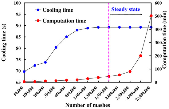 Number of meshes as a function of the computation time and cooling time of the molded part.