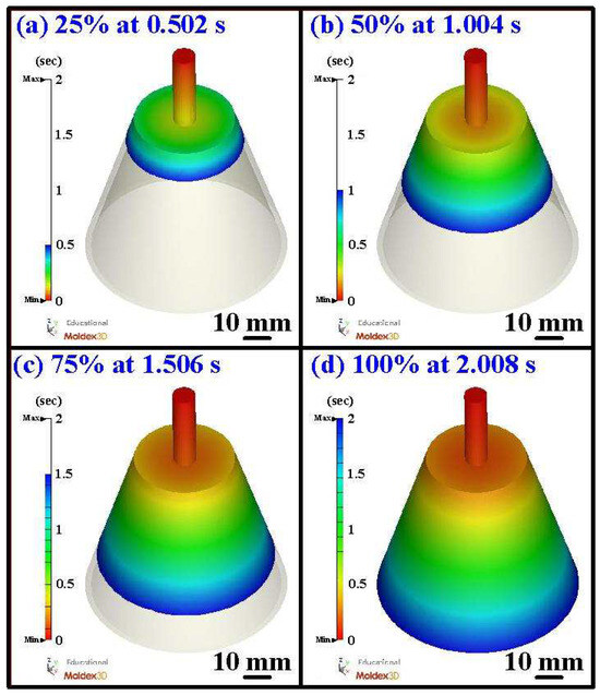 Figure 9 shows the number of meshes as a function of the computation time and cooling time of the molded part. According to practical experience, increasing the number of meshes leads to a longer total computation time for the simulation. It becomes evident that the cooling time of the molded part stabilizes when the mesh element count surpasses 1,550,000. The cooling time of the molded part is about 89.24 s. Consequently, a mesh size of approximately 1 mm seems to be the optimal choice, considering both the cooling time of the molded part and the total computation time of the simulation. Figure 10 shows the short shot of the water cup. According to the simulation results, the filling process exhibited a smooth flow, completing in approximately 2.008 s. After the filling was completed, there was no short shot [25] in the molded product, and no meld line [26] or weld line [27] was found. This result also confirms the suitability of the designed filling system [28].