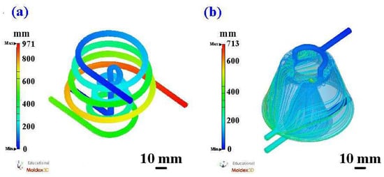 Coolant flow length of silicone rubber mold with (a) CCC and (b) WCC.