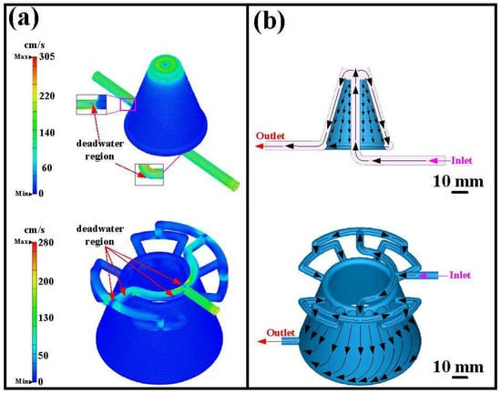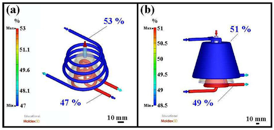 Figure 13 shows the coolant flow rate and schematic diagram of the coolant flow for the silicone rubber mold with CCC. The results show that the maximum flow velocity of the CCC for the core insert is approximately 338 cm/s, and the maximum flow velocity of the CCC for the cavity insert is approximately 257 cm/s. It should be noted that some dead water regions at the corners were found in the core insert. Figure 14 shows the coolant flow rate and a schematic diagram of the coolant flow for the silicone rubber mold with the WCC. Figure 15 shows the cooling efficiency of the silicone rubber mold with the CCC and the silicone rubber mold with the WCC. As can be seen, the cooling efficiency for a silicone rubber mold with WCC is better than that of the silicone rubber mold with CCC since the core and cavity cooling efficiency is close to 50%.