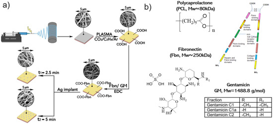 In the present work, PCL nanofibers coated with a plasma layer rich in COOH groups were fabricated. Fibronectin and gentamicin were attached to the nanofiber surface. Additionally, PCL nanofibers with protein and antibiotic attached were implanted with Ag ions. The sample chemical structure was studied based on a new XPS approach to fitting the C1s curve after each modification step. Finally, the biological characteristics of the resulting nanofibers were evaluated.