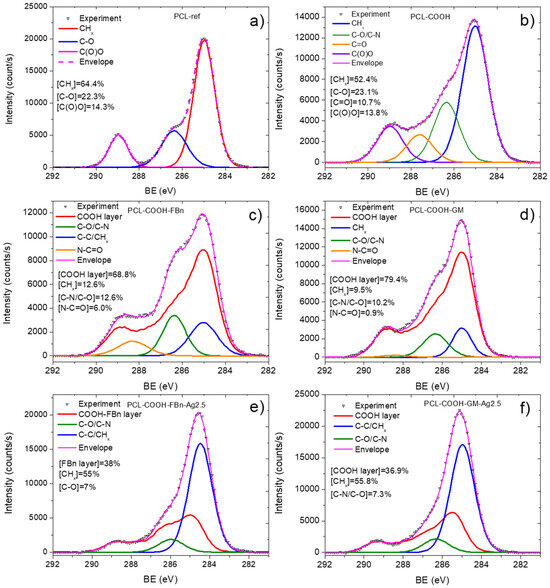 XPS C1 spectra of PCL-ref (a), PCL-COOH (b), PCL-COOH-FBn (c), PCL-COOH-GM (d), PCL-COOH-FBn-Ag2.5 (e), and PCL-COOH-GM-Ag2.5 (f) materials.