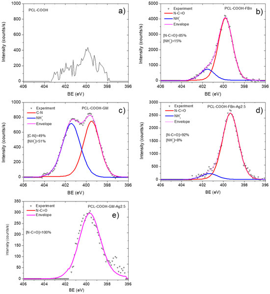 XPS N1 spectra of PCL-COOH (a), PCL-COOH-FBn (b), PCL-COOH-GM (c), PCL-COOH-FBn-Ag2.5 (d), and PCL-COOH-GM-Ag2.5 (e) materials.
