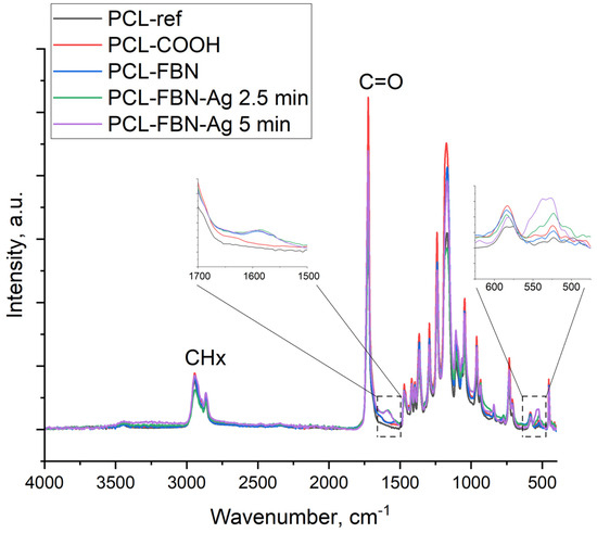 For additional surface characterization, FTIR spectroscopy was used. The obtained FTIR spectra are presented in Figure 5. All samples exhibited characteristic features inherent in the structure of polycaprolactone [25,26]: the peak at 1720 cm−1 is attributed to the carbonyl group of the ester group, peaks in the range of 3000–2800 cm−1 are assigned to the asymmetric and symmetrical C-H2 stretching, and maxima at 1300 and 1000 cm−1 are characteristic of CO stretching. Absorption bands at 1448 cm−1 (in-plane vibrations) and 988 cm−1 (out-of-plane vibrations) evidence the presence of C-O-H (carboxylic acid). There are also H-C-H bending vibrations observed at 1400 cm−1. Treatment of the PCL-ref sample in plasma did not lead to significant changes in its IR spectrum due to the similarity of the chemical composition of the plasma-deposited polymer with the structure of polycaprolactone [22]. Immobilization of fibronectin led to the formation of a peptide bond (characteristic peak at 1650 cm−1) [27]. Ag ion implantation led to the appearance of an additional peak located around 550 cm−1, which was attributed to Ag oxide lattice vibrations [28,29].