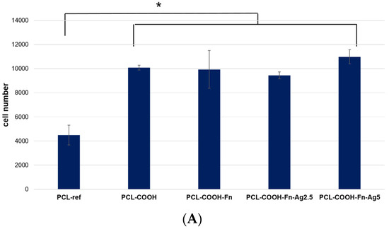 We have determined the number of cells on the surface of nanofibers after 24 h of cultivation. The results (Figure 6) show that the number of cells is significantly lower on the surface of the PCL-ref sample compared to the PCL—COOH, PCL—COOH-Fn, PCL—CO OH—Fn-Ag2.5, and PCL-COOH-Fn-Ag5 counterparts. These results are comparable with our previous data and are explained by the increased surface hydrophilicity (in the case of PCL-COOH), as well as the additional effect of fibronectin, an active component of the ECM necessary for effective cell adhesion. Surface bombardment with Ag ions, described in previous sections, shows a decrease in the concentration of fibronectin. However, the number of attached, proliferating, viable cells on the PCL-COOH-Fn-Ag2.5 and PCL-COOH-Fn-Ag5 surfaces is not significantly different from the PCL-COOH-Fn material.