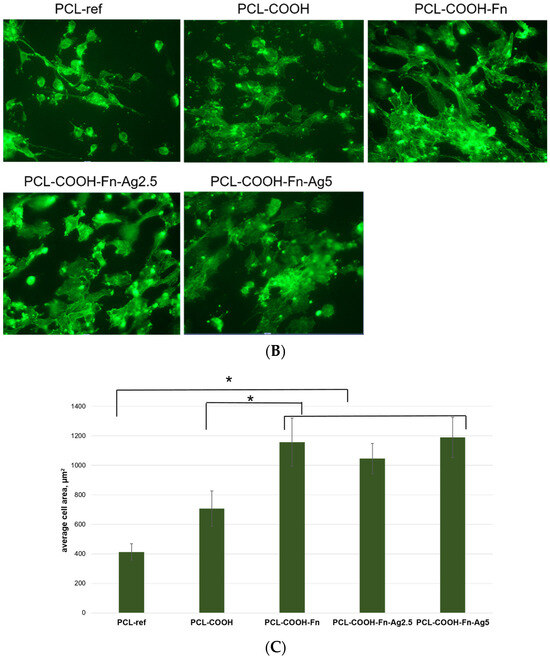 Figure 6C demonstrates the significant effect of surface composition on cell spreading area. Thus, the minimum cell size is observed on the untreated hydrophobic surface of the PCL-ref material (413 ± 55 μm2), while modification with COOH groups significantly increases the adhesiveness and cell spread area (706 ± 119 μm2). These results are in good agreement with our previous data [13]. Surface coating with fibronectin does not affect the total number of cells but significantly increases the cell area (1156 ± 163 μm2) and also improves the organization of the actin cytoskeleton, which indicates high fibroblast activity (Figure 6B,C). There is no significant difference in the cell area on the surface of the PCL-COOH-Fn, PCL—COOH—Fn-Ag2.5, and PCL-COOH-Fn-Ag5 samples; however, the percentage of cells with a developed cytoskeleton is lower in the PCL-COOH-Fn-Ag2.5 material (Figure 6B).