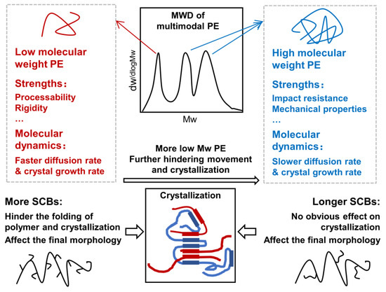 Effects of different molecular weight PE components and SCB characteristics on the properties and crystallization process of multimodal PE systems.