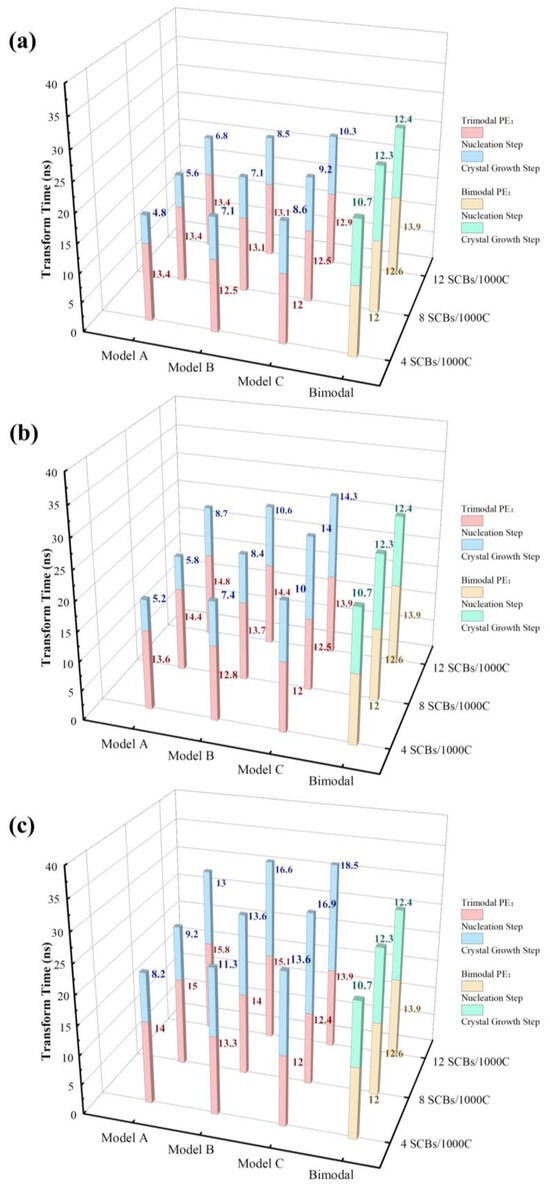 In our work, a series of trimodal PE models with different MWDs and SCB characteristics were established. Molecular dynamics simulation was conducted to study the molecular mechanism and effect of the MWD, especially the mechanism of nucleation and crystallization of the trimodal PE at the molecular level.