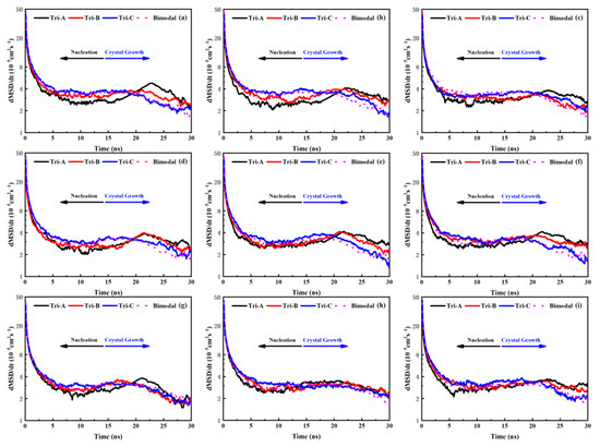 The mobility of the backbones under different MWDs and SCBCs: (a) C4L4-M; (b) C4L4-L; (c) C4L4-ML; (d) C8L4-M; (e) C8L4-L; (f) C8L4-ML; (g) C12L4-M; (h) C12L4-L; and (i) C12L4-ML.