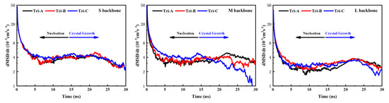To better prove this point, Figure 3 provides the change in the dMSD (dt = 0.1 ns) over time to express the diffusion capacity or mobility of the backbones in the system under the same SCB characteristics but different MWDs. It is apparent from this figure that the variation in the mobility of the backbone with the time of the different models was complementary to the law of the transformation time of the nucleation step and crystal growth step discussed above. That is, the mobility of the backbone of the model with a lower short backbone concentration (like model A) was weaker in the nucleation stage, while the mobility of the backbone became stronger in the crystallization process. On the contrary, the mobility of the backbone of the model with a higher short backbone concentration (like the bimodal model and model C) was faster in the nucleation stage, but the mobility of the backbone continued to drop during the crystallization process. Due to the stronger diffusion capacity of short backbones, there were good reasons to believe that the diffusion of the short backbones mainly occurred in the nucleation stage, considering the variation in the dMSD/dt with time in the different PE models. Therefore, it also offered us a hint that a great deal of short backbones as an obstruction hindered the diffusion of the medium and long chains at the crystal growth stage in the model with a higher concentration of short backbones. Take model C4L4-L as an example: Figure 4 shows the mobility of the S, M and L backbones in trimodal PE under different MWD systems. It can be noted that the movement of the short backbone in the three trimodal PE models was very similar, and the dMSD/dt of the S backbone at the nucleation stage was significantly larger than that of other molecular weight backbones. For the medium and long backbones, the differences in their mobility between the three trimodal PE models can be clearly observed (the difference between L backbones is not obvious because there are SCBs distributed on it, which reduces the motility of L backbone). At the nucleation stage, the motility of the medium and long backbones is: model C > model B > model A, and it is completely the opposite at the crystal growth stage. This proves that in systems with a higher content of S backbones, the short backbones will hinder the motility and diffusion of the medium and long backbones during the crystal growth stage, thereby affecting the crystallization process of the trimodal PE system.