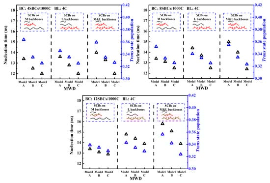 The variation in the transform time and trans state population at the nucleation stage with different MWDs and SCBDs (black triangle: nucleation time; blue triangle: trans state population).