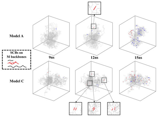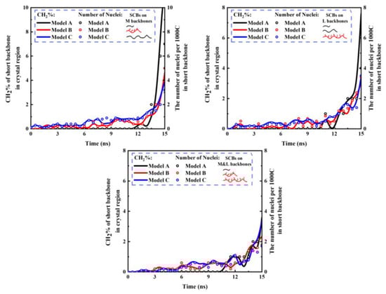 To verify this hypothesis, the CH2% in the crystal region and the number of nuclei per 1000C of the short backbone in the trimodal PE model with different MWDs are illustrated in Figure 6. It can be observed that the short backbones in model C had already started to nucleate and partially crystallize in the early nucleation stage, and this phenomenon also occurred in model B. Figure 7 shows the crystallization process of different backbones of the trimodal PE model with different MWDs at the nucleation stage and the beginning of the crystal growth stage when the SCBs were distributed on the medium backbone (more comparison results under different SCBD are provided in the Supplementary Material as Figure S1). It can be observed that at 9 s, there was no obvious difference between the two models except that model C had a few short backbones that had formed few nuclei. At 12 s, the nucleation of the medium and long backbones in the two models was basically the same. However, the short backbone of model A had only one nucleus, which only can be formed by the intra-chain nucleation, while the short backbones of model C had 6–8 nuclei formed by the inter-chain nucleation (the two nuclei are close to each other and parallel). This indicated that inter-chain nucleation was easier to occur in model C, which had a higher concentration of short backbones. Because the diffusion capacity of the short backbone was greater, the nucleated short backbone would quickly begin to crystallize and occupy the crystallization space of the medium and long backbones. From the morphologies of 15 s, it can be seen that the nuclei formed by the short backbone in model A only distributed in a small part of the system, and a large number of CH2 units in the medium and long backbones had begun to crystallize. However, the nuclei formed by the short backbones in model C were distributed in various positions, even in the central region of the crystal, and the number of CH2 units in the medium and long backbones was significantly less than that in model A. Since the space was occupied by the short backbones, the medium and long backbones with poor diffusion capacity in model C took longer to fold and crystallize to avoid the crystallized short backbones.