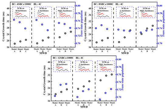 The transformation time and trans state population corresponding to the nucleation stage of the trimodal PE with different MWD are shown in Figure 5. Previously, it was observed in Figure 2 that models with a higher long backbone content had a shorter nucleation time. From Figure 5, it can be seen that the models with a lower long backbone content also had a lower trans state population at the end of the nucleation stage. This meant that the nucleation capacity was weakened in the nucleation stage when the long backbone content decreased. But that still could not explain why the trans state population of the models with a lower long backbone concentration started to increase substantially earlier. That is, the apparent nucleation time was shorter.