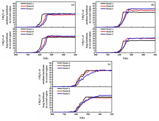 Figure 8 shows the variation in the crystal growth time and trans state population at the crystal growth stage with different MWDs and SCBDs. In addition to the obvious observation that the model with a lower long backbone concentration had the slowest crystal growth time, it can also be observed that the trans state population of the trimodal PE decreased with the increase in the SCB concentration, but the decreasing rate was model A > model B > model C. This was mainly due to the fact that the crystallization capacity of the PE chain with SCBs was significantly decreased with the increase in the SCB concentration, but the crystallization capacity of the short backbone was not significantly affected. Therefore, model C, with the lowest concentration of short backbones, was the least affected, while model A, with a high concentration of medium and long backbones, would be the most affected. Returning to the discussion of the crystal growth time, Figure 9 shows the variation in the CH2% in the medium and long backbones in the crystal regions with the time in the trimodal PE model with different MWDs. It can be noticed that the medium and long backbones in model C, with a lower long backbone concentration and higher short backbone concentration, took longer time to reach the stable state of crystallization. Meanwhile, by studying the final morphology of model A and model C when the SCBs were distributed on the medium backbone as shown in Figure 10 (more comparison results under different SCBDs are provided in the Supplementary Material as Figure S2), it is clear that the short backbone of model A occupied only a small part of the crystal region, while the short backbones of model C were entangled and crystallized with the medium and long backbones everywhere. This phenomenon could be seen more clearly by observing the section diagram. There was no short backbone between the medium and the long backbones in most of the crystal regions in model A. On the contrary, the segments of the three different molecular weight backbones in model C were evenly distributed in the crystal region. This indicated that the difference in the crystal growth stage was also caused by the diffusibility of the trimodal PE models with different MWDs. For the model with a lower concentration of short backbones, after nucleation, the diffusion of each backbone was not affected due to the small number of backbones in the system, so that the faster folding and formation of lamella could be achieved. However, for the model with a higher concentration of short backbones, the backbones were entangled with each other, and the diffusion capacity of the backbones, especially the medium and long backbones, was greatly affected by the crystallized short backbones, thus increasing the time required for crystal growth (which has been elaborated in the discussion of Figure 4 in Section 3.1).