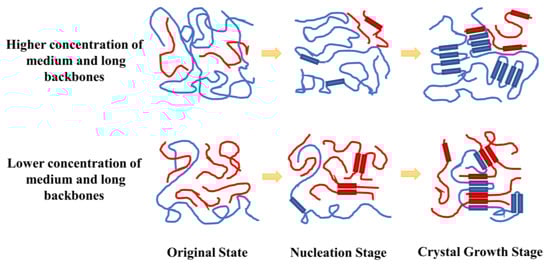 Schematic illustrations of the mechanism of the nucleation and crystallization under different MWDs (blue line: medium and long backbones in the amorphous region; red line: short backbones in the amorphous region; blue block: medium and long backbones in the crystalline region; red block: short backbones in the crystalline region).