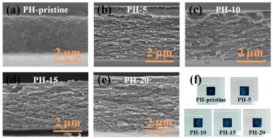 Cross-section SEM images of (a) pristine PEDOT:PSS film; (b) film water treated 5 times; (c) film water treated 10 times; (d) film water treated 15 times; (e) film water treated 20 times. (f) Optical photograph of all samples.