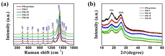 Variations in PEDOT:PSS structures before and after different cycles of water washing treatment: (a) Raman spectra; (b) XRD spectra.