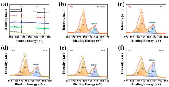 To confirm the compositional changes in the treated films further, an X-ray electron spectroscopy (XPS) analysis was also performed, and its results are presented in Figure 4. The elements C, O, and S were identified in the full-range XPS spectra. The reduction in the insulating PSS content from PEDOT:PSS films during the H2O treatment was confirmed by analyzing the S2p spectrum in the XPS. As illustrated in Figure 4b–f, the binding energies between 166 and 172 eV corresponded to sulfur atoms S2p bands in PSS, while the ones between 162 and 166 eV were related to the S2p bands of sulfur in PEDOT [33]. Moreover, PEDOT bands featured two peaks at approximately 164 eV and 165 eV for S2p3/2 and S2p1/2 thiophene sulfur, while two peaks at around 168 eV and 169 eV corresponded to the S2p3/2 and S2p1/2 sulfur of PSS. Based on the changes in peak areas corresponding to PSS and PEDOT, the structural modifications of the films were inferred. Calculations revealed that the PSS/PEDOT ratio decreased from 3.02 to 2.84, 2.42, 2.13, and 1.55 after 5, 10, 15, and 20 water washing cycles, respectively. This reduction can be ascribed to the conformational changes resulting from the removal of PSS during the H2O washing process, indicating that PSS was progressively eliminated with an increasing number of H2O treatments. The selective removal of the nonconductive-phase PSS effectively enhanced the conductivity of the PEDOT:PSS films. Additionally, the XPS results were consistent with the observed increase in electrical conductivity.