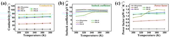 Figure 5b illustrates the Seebeck coefficient variation in PEDOT:PSS films following different water treatment cycles. The untreated film maintained a Seebeck coefficient of ~16.34 µV K–1, which gradually decreased to 16.10, 15.24, 14.53, and 11.73 µV K–1 after 5, 10, 15, and 20 wash cycles, respectively. This decrease likely correlates with the marked increase in carrier concentration due to PSS reduction. Figure 5c displays the power factor variation, showing that the pristine PEDOT:PSS film had a power factor of 0.0066 µW·m–1·K–2 due to low conductivity. Post water treatment for 5, 10, 15, and 20 cycles, the power factors reached 0.6971, 1.3473, 1.3282, and 1.0514 µW·m–1·K–2, respectively. During heating, the power factor of the thin film exhibited an upward trend, reaching 1.7986 µW·m–1·K–2 at 360 K after 20 wash cycles, which is at least 200 times higher than that of the pristine film. This upward trend of the power factor with temperature may be associated with the changes in the PEDOT:PSS structure, such as a transformation from a benzenoid type to a quinoidal one and the subsequent increase in the crystallinity [26,34].