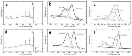 XPS spectra of BC26/74-O: survey (a), the high-resolution of N 1s (b), and C 1S (c); XPS spectra of BC26/74-S: survey (d), the high-resolution of N 1s (e), and S 2p (f).