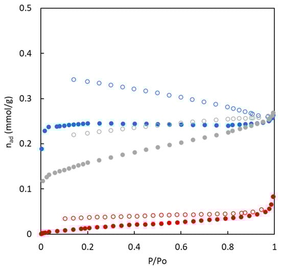 Adsorption (full symbols) and desorption (empty symbols) isotherms of N2 (77 K) for carbons from copolymers in the absence of sulfur. BC10/90-O (blue), BC26/74-O (grey), BC43/57-O (red).