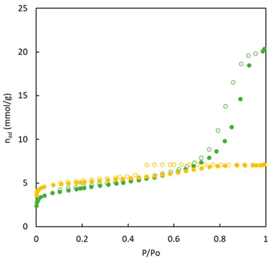 Adsorption (full symbols) and desorption (empty symbols) isotherms of N2 (77 K) for carbons from copolymers doped with sulfur. BC10/90-S (green), BC26/74-S (yellow).