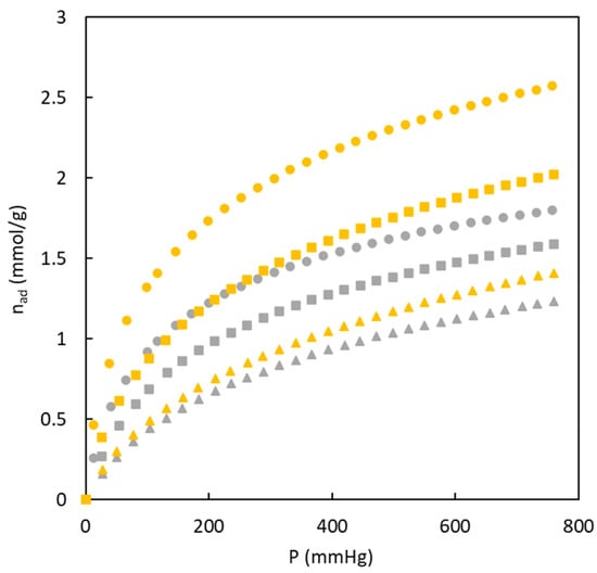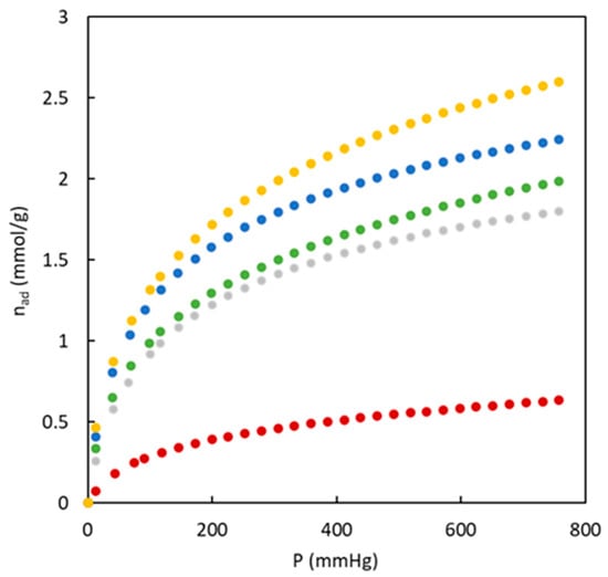 This work also analyzes the influence of temperature on CO2 adsorption isotherms. Figure 10 shows some examples of the gas adsorption experimental results for this type of analysis. In all cases, a temperature increase favors the decrease in the amount of CO2 adsorbed, which agrees with the existence of physical adsorption. In order to use these materials for gas separation operation (specifically for CO2 separation) by adsorption, chemical adsorption must be avoided to reduce the cost associated with sorbent regeneration.