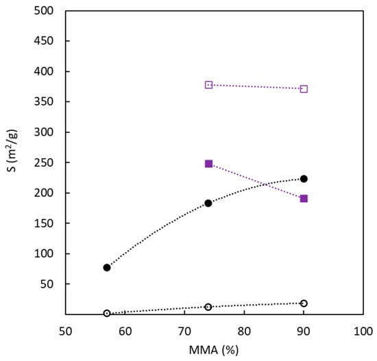 Effect of copolymer composition upon the surface area determined by the adsorption of N2 at 77 K and CO2 at 273 K. Without sulfur: (black empty circle) N2 at 77 K, (black full circle) CO2 at 273 K. With sulfur: (purple empty square) N2 at 77 K, (purple full square) CO2 at 273 K.
