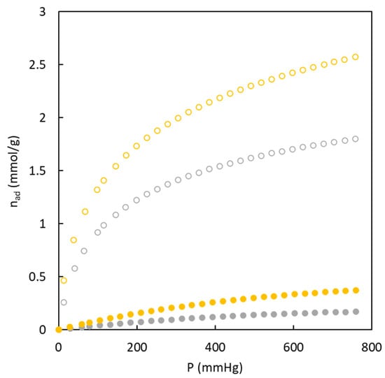 Adsorption isotherms experimental data for N2 (full symbols) and CO2 (empty symbols) at 273 K. BC26/74-O(grey), BC26/74-S (yellow).