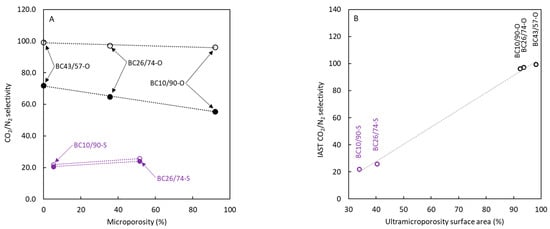 Influence of microporosity, determined with N2 at 77 K (A), and ultramicroporosity, determined by comparing surface area determined with N2 at 77 K and CO2 at 273 K on CO2 selectivity data (B). (full symbols) apparent selectivity, (empty symbols) IAST selectivity.