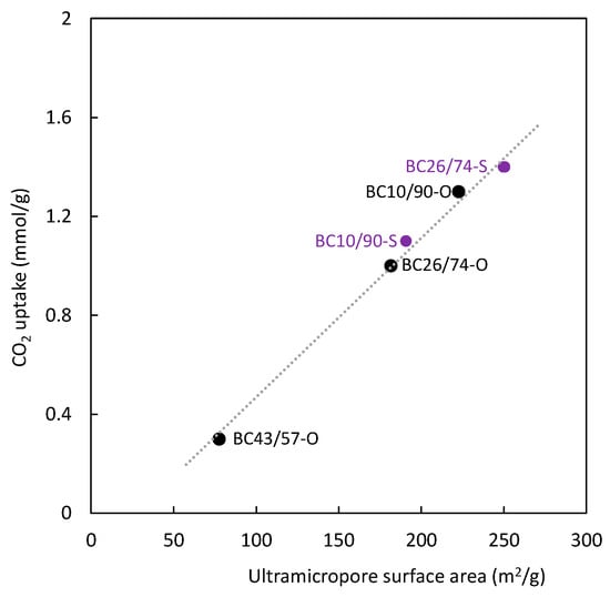The previous results’ discussion about carbon dioxide uptake and selectivity allows us to conclude the high importance of some porous characteristics of sorbents, such as surface area (mainly ultramicropore one), pore size, and pore volume. In addition, the presence of heteroatoms can provide suitable surface characteristics in order to adsorb CO2. Carbons fabricated in the present work have shown a slight increase in the presence of N in BC-O materials while sulfur was detected in BC-S ones. The enhancement of CO2 adsorption was not clearly detected by the presence of these heteroatoms [45,46], but the presence of sulfur causes an increase in the size of pores, increasing the CO2 uptake and reducing the selectivity.