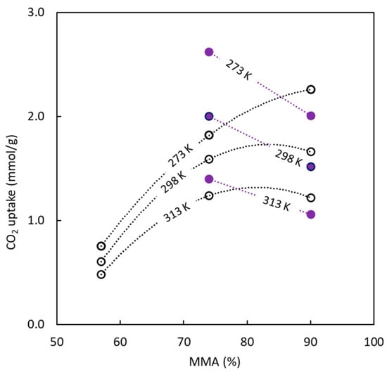 In relation to the influence of copolymer composition upon CO2 uptake, Figure 11 tries to explain the effect of temperature and copolymer composition. For all adsorbents, an increase in temperature causes a decrease in the amount of CO2 adsorbed, but the effect caused by BC composition shows different behaviors. The sulfur-doped carbons show a decrease in the CO2 uptake values with MMA concentration, unlike the materials synthesized without sulfur, which show the opposite behavior. These trends are influenced by the pore size that sacrificial PMMA generates. For materials produced in the presence of sulfur, an increase in MMA percentage in the precursor increases the pore size while lowering the CO2 uptakes (previously discussed). The opposite effect is observed for carbons obtained without sulfur.