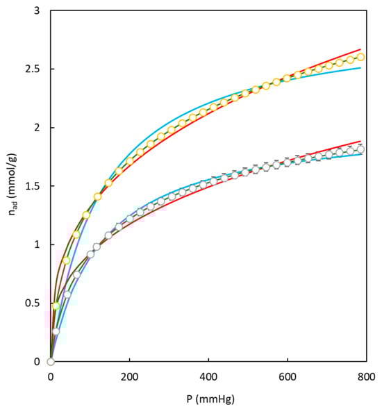 Examples of the fitting behavior of models used in present work for CO2 adsorption experimental data at 273 K. BC26/74-S (◯, yellow), BC26/74-O (◯, green). Langmuir (blue), Freundlich (red), Toth (green).