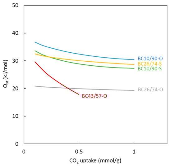 The experimental data displayed in Figure 10 also highlight that the effect of temperature on the amount of CO2 adsorbed is different for both materials (BC 26/74-O and BC 26/74-S), and this difference could affect the energy involved in the adsorption process.