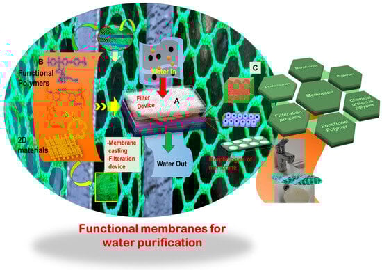 Human activities and interventions in ecosystems have led to numerous global challenges [,]. Among these, the availability of freshwater for drinking stands out as a significant concern. Scarcity of potable water in many regions worldwide presents a formidable challenge for sustaining life on this planet []. Large quantities of chemicals from industrial plants and households are dumped into rivers and other natural water reservoirs []. These chemicals or pollutants mainly comprise heavy metal ions, dyes, and other organic contaminants. They accumulate in water bodies, posing risks to living organisms and causing not only water pollution but also potentially life-threatening illnesses, such as cancer [,,,]. Consequently, there is an urgent need for efficient methods to remove or decompose these pollutants, prompting extensive research in this area. Most of these techniques involve incorporating functional materials, such as polymers or hybrid composites, within the performing device [,,,]. While bulk materials have also been utilized for this purpose, there has been a growing emphasis on focusing on nanoscale functional materials. This is because nanomaterials can provide several benefits ranging from control over the morphology to selectivity and fabrication [,,,]. Among these nanomaterials, polymers are of particular interest as they offer multiple features (as mentioned above) suitable for similar applications. In polymers, the introduction of a specific chemical functional group (polar or nonpolar) before or post synthesis can help determine the final morphology and selectivity for a particular pollutant and its removal during the water treatment process [,,,,,,,]. The chemical and physical properties of a polymer, characterized by a well-designed backbone and desired functional groups, play a considerable role in the fabrication of water purification devices or units [,,]. Functional polymers employed in water treatment processes are modified with polar or ionic groups, such as hydroxyl, carboxylic, amine, phosphonic, and sulfonic groups, among others, to remove a specific pollutant (for example, a metal) [,,,]. Therefore, when designing functional polymers, the removal pathway in the water treatment process must be considered. To further understand the holistic approach applied to functional polymers concerning their morphology, selectivity, and role in the water treatment processes, it is essential to summarize and highlight all the recent research efforts aimed at developing efficient functional polymers dedicated to pollutant removal. This review provides a detailed presentation of functional polymers, encompassing their distinctive features, microstructures, fabrication techniques, and water treatment properties. This thorough review aims to provide readers with a comprehensive overview of the advancements in functional polymer-based water purification methods to date. Additionally, this review sheds light on prevalent challenges associated with the performance of these polymers, offering a roadmap to address these concerns. The functional polymers under scrutiny are categorized as water-soluble and insoluble, contingent on their repeating units and chemical functional groups. Both types of polymers have found application in various extraction methods, including liquid–liquid extraction, adsorption, and precipitation, based on the distribution of the two phases [,]. These methodologies are directly related to the morphology, functionality, and dimensions of the polymeric phase in a membrane [,]. Numerous functional polymers have been specifically designed and fabricated for use in membrane preparation. As shown in Figure 1, as a membrane material the functional polymer is an essential component of a water purifier device. Its morphology also plays a decisive role in selective filtration or removal of certain pollutants.