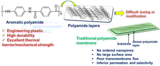 Synthetic aromatic PAs are preferred over their aliphatic counterparts because the latter exhibits increased moisture susceptibility, resulting in mechanical weakness and dimensional deformities. Notably, aromatic PAs such as polyphthalamides (PPAs) are processable in the molten state and have accordingly attracted considerable commercial attention. Aromatic PAs have found significant utility exploited as membrane materials owing to their superior hydrolytic and permselective properties. Despite PAs being the gold standard in both academic and industrial efforts for membrane preparation, achieving precise tuning of the PA layer remains a challenging task (Figure 4). For example, the permeability and selectivity of PA-based membranes are directly related to their morphology. To produce the desired morphology wherein PA chains can form dense yet thin layers with a larger surface area (via nanopores), optimization of various parameters becomes crucial. These include the chemical structure of the monomer, fabrication processes, and the structural properties of the porous support. Notably, thin and dense layers are employed to improve permeation within these membranes. Previously, several strategies were introduced for fabricating dense and thin layers of PA chains, including layer-by-layer (LBL) assembly, the addition of interlayers or hydrophilic materials, and 3D printing [,]. Studies suggest that aromatic PAs can exhibit porosities ranging from approximately 15 ± 2% to 32 ± 4%. However, increasing the specific surface area via these nanopores enables high-mass crossflow and permeation. For precise nanopore creation, IP using emulsion and template methods is considered highly effective. In IP, a hydrophilic monomer is incorporated and polymerized at the interface, generating a high specific surface area in the resulting polymeric film. Furthermore, the presence of a hydrophilic additive or polymer affects solution viscosity and diffusion rate, directing the formation of a nanoporous morphology in the film []. Nevertheless, attempts are ongoing to fabricate defect-free PA membranes, featuring dense layers and ordered nanopores. The pursuit of a perfect membrane aims to establish an optimized water transport pathway, wherein the limits of permeability and selectivity would surpass those of previously reported membranes.