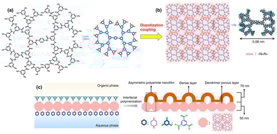 Strategy for creating a double-layered membrane comprising the following: (a) hyper-branched–amine-terminated dendrimer which, upon further coupling via diazotization, forms (b) a porous layer on a support, followed by (c) IP of two different monomers, namely PIP and TMC, conducted on the porous layer. This process aims to produce a dense and thin asymmetric successive layer of PA with an optimized transport pathway and ordered nanovoids. Reprinted with permission from Nature Comm. [], Copyright 2020 Nature Portfolio. The article is licensed under a Creative Commons Attribution 4.0 International License, which permits use, sharing, adaptation, distribution, and reproduction in any medium or format, as long as you give appropriate credit to the original author(s) and the source, provide a link to the Creative Commons license, and indicate if changes were made.