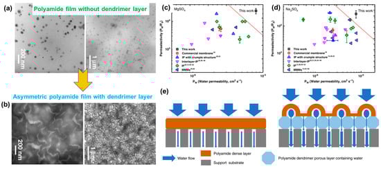 Morphological features of an asymmetric PA membrane: (a) TEM micrographs without the dendrimer; (b) with the covalent assemblies of dendrimer; (c,d) permeation and selectivity of an asymmetric membrane produced via IP on dendrimer and other available membranes reported in the literature, including commercial ones; and (e) schematic representation illustrating the transportation of water (salt water) across the membrane without and with a dendrimer porous layer, as fabricated via diazotization prior to IP. Reprinted with permission from Nature Comm. [], Copyright 2020 Nature Portfolio. The article is licensed under a Creative Commons Attribution 4.0 International License, which permits use, sharing, adaptation, distribution, and reproduction in any medium or format, as long as you give appropriate credit to the original author(s) and the source, provide a link to the Creative Commons license, and indicate if changes were made.